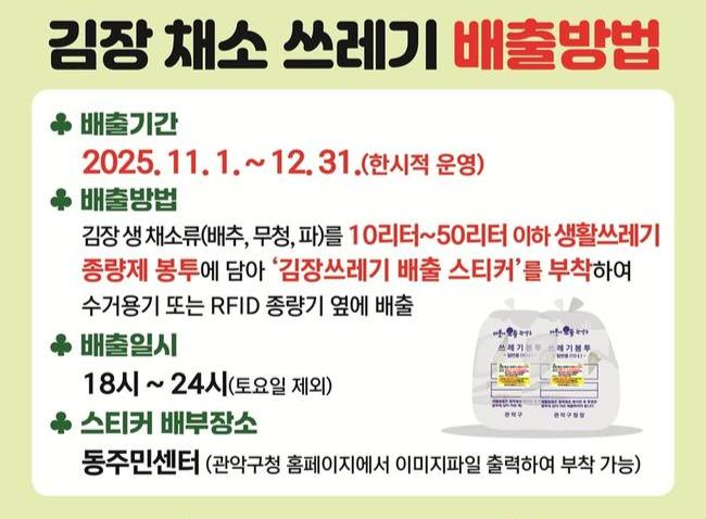 관악구(구청장 박준희)는 김장철을 맞아 대량으로 발생하는 채소류 쓰레기로 인한 주민 불편을 해소하고 쾌적한 생활환경을 조성하기 위해 11월 1일부터 12월 31일까지 `김장철 채소쓰레기 특별처리 기간`을 운영한다.