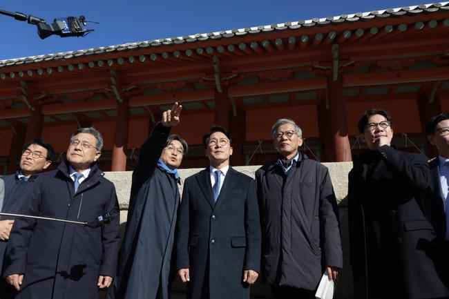 김민석 국무총리가 지난 10일 서울시의 종묘 앞 고층건물 허용과 관련 허민 국가유산청장, 유홍준 국립중앙박물관장 등과 함께 종로구 종묘를 방문, 외부 조망을 점검하고 있다.