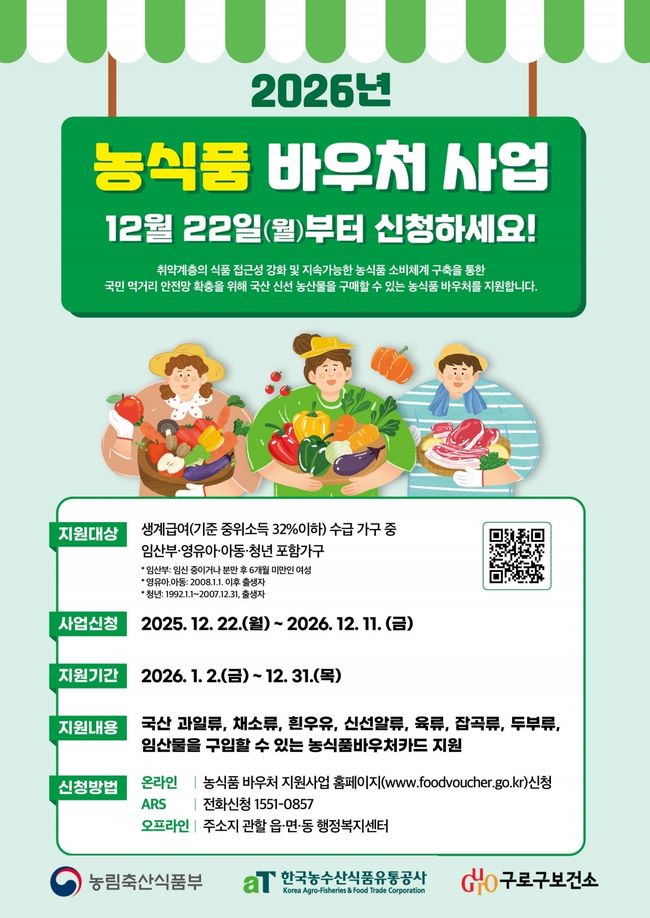26년 농식품 바우처 지원사업 홍보 포스터.23일 서울 구로구는 취약계층의 식비 부담을 완화하고 균형 잡힌 영양 섭취를 지원하기 위해 ‘농식품 상품권(바우처) 지원 사업’을 추진한다고 밝혔다. 농식품 바우처는 지급된 전용 카드에 매월 지원금이 충전되는 방식으로 운영된다.