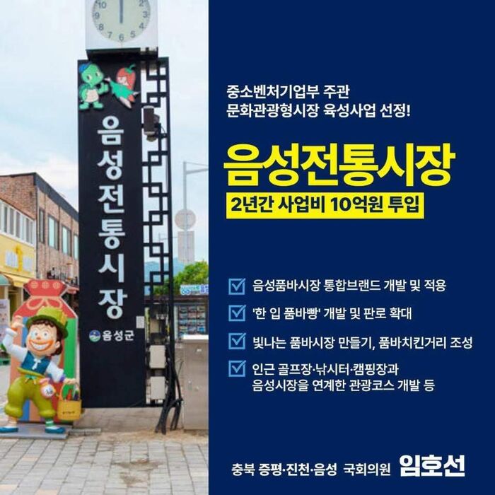 음성전통시장이 중소벤처기업부가 주관하는 문화관광형시장 육성사업에 최종 선정됐다. 전통시장에 지역 고유의 문화와 관광 요소를 접목해 경쟁력을 높이는 이번 사업 선정은 음성군 지역사회에 반가운 소식으로 전해지고 있다.