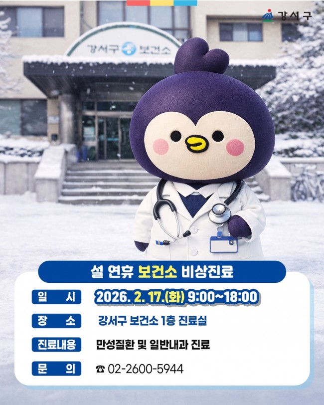 서울 강서구(구청장 진교훈)는 오는 14일(토)부터 18일(수)까지 이어지는 설 연휴 동안 의료공백을 최소화하기 위해 `설 연휴 응급진료체계`를 가동한다고 밝혔다.