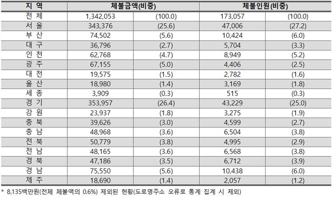 이 두 지역을 합치면 체불액이 전체의 절반(6,974억 원, 52.0%)을 차지하는 것으로 나타났다. 이는 수도권에 사업체와 노동자가 집중된 구조적 요인 때문이라는 분석이다.