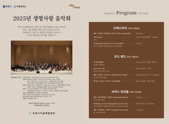 부천시는 부천시자살예방센터와 함께 세계 자살예방의 날을 맞아 9월 6일 부천아트센터 소공연장에서 ‘2025 생명사랑 음악회’를 개최했다.