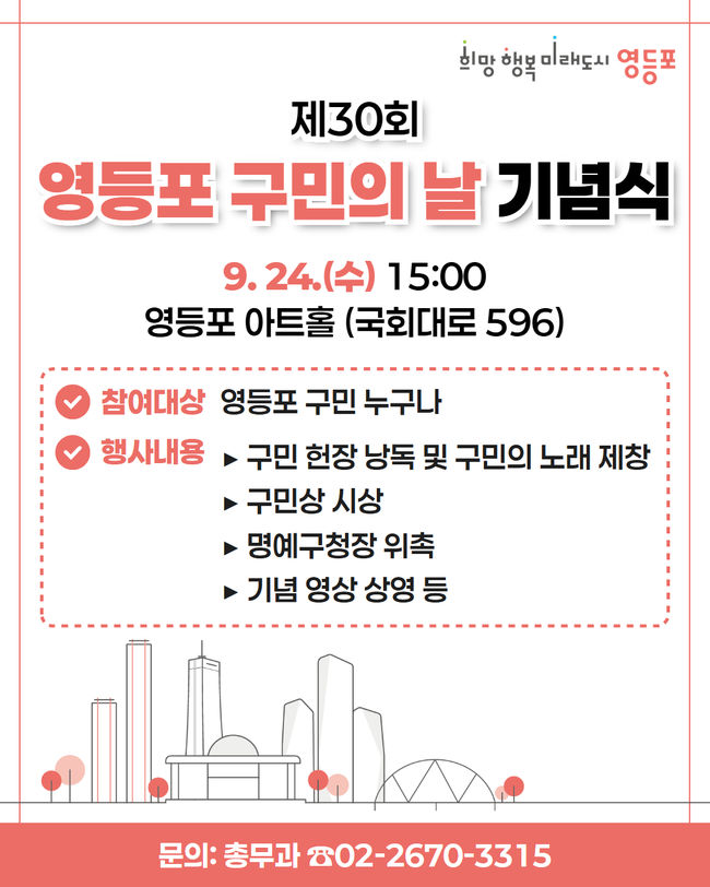 이어 9월 24일 오후 3시 영등포 아트홀에서는 기념식이 진행되며, AI가 바라보는 영등포의 미래 영상 상영, 민선 8기 3주년 성과 영상 상영, 구민 헌장 낭독, 명예구청장 위촉, 구민상 시상, 구민의 날 노래 재창 등 다채로운 순서로 꾸려진다.