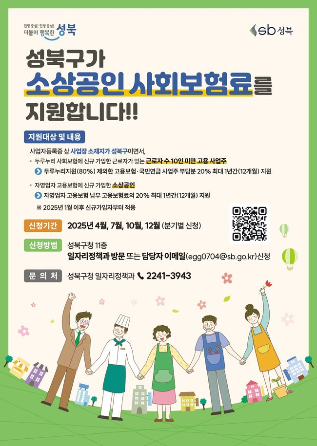 성북구(구청장 이승로)는 오는 10월 13일부터 17일까지 2025년 ‘성북구 소상공인 사회보험료 지원사업’ 3분기 신청을 받는다.