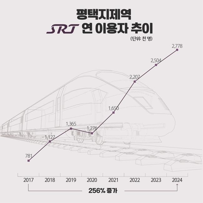 평택지제역은 2016년 개통 당시부터 SRT가 정차한 역사로, 매년 이용객 수가 꾸준히 증가하고 있다. 실제 `철도연감`에 따르면 평택지제역의 연간 SRT 승하차 인원은 2017년 78만 1천 명이었지만, 2024년에는 277만 8천 명으로 256%의 증가율을 기록했다. 이러한 증가율은 SRT 역사 중 가장 높은 수치다.