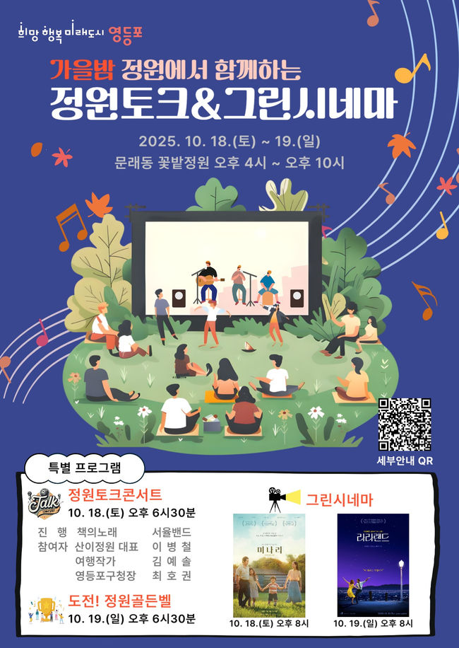 영등포구가 주민들이 자연과 문화를 함께 즐길 수 있는 ‘정원토크콘서트 & 그린시네마’를 개최한다.